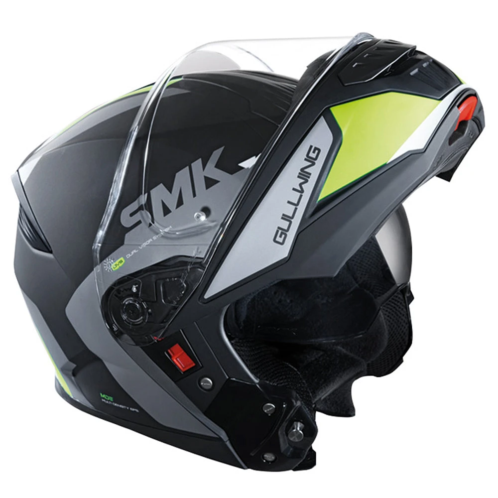 SMK Gullwing offers a complete range of features such as internal retractable sun visor, wind stops, and Pinlock® ready main visor to prevent fogging. Available in unicolor and high-visibility decal options.